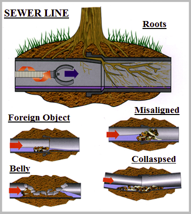 Main line stoppages due to roots, debris or defective sewer line pipe issues, which cause sewage to back up into the home or business. Fixtures like toilets that are overflowing can also leak sewage into the building. Flushed sewage comes back up into showers, bathtubs, and/or floor drains.